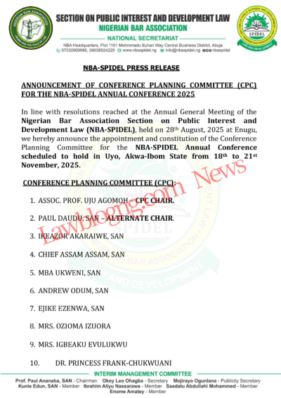 The Nigerian Bar Association’s Section on Public Interest and Development Law, NBA SPIDEL has appointed six weeks old lawyer and former Kogi Lawmaker, Senator Dino Melaye, as a member of the Section’s Conference Planning Committee for the Section’s Conference coming up in Uyo Akwa Ibom State from 18th to 21st November 2025.