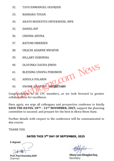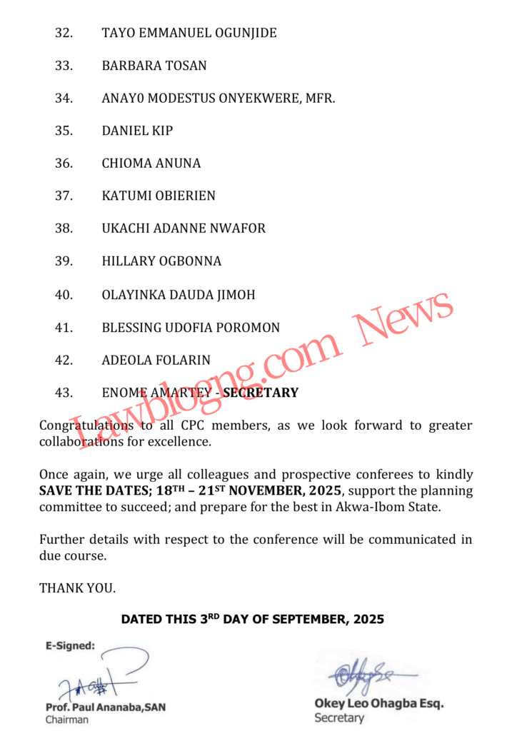 The 43 members committee will be chaired by Assoc. Prof. Uju Agomoh, with Paul Daudu, SAN, serving as the Alternate Chairman. The list also features several distinguished Senior Advocates of Nigeria, including Ikeazor Akaraiwe, SAN, Chief Assam Assam, SAN, Mba Ukweni, SAN, Andrew Odum, SAN, and Ejike Ezenwa, SAN, among others. Enome Amartey has been appointed as the Secretary of the Committee.