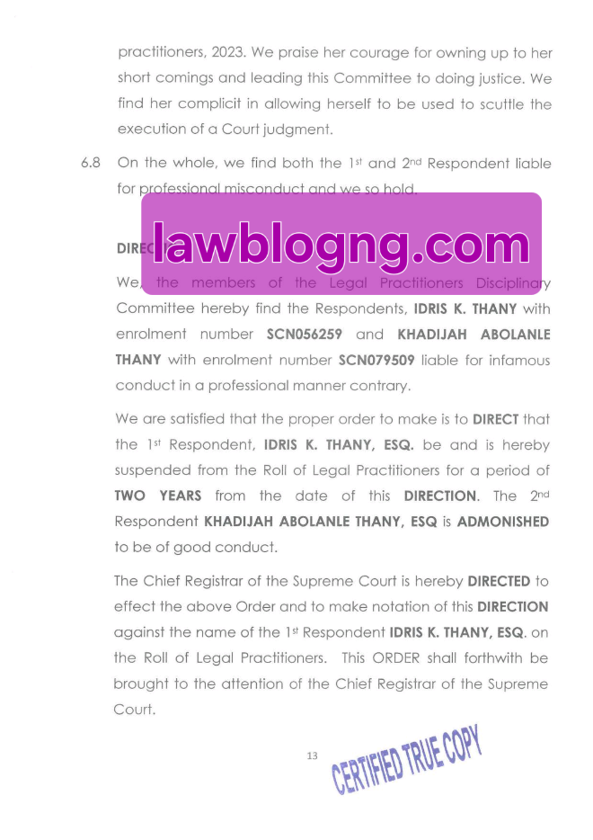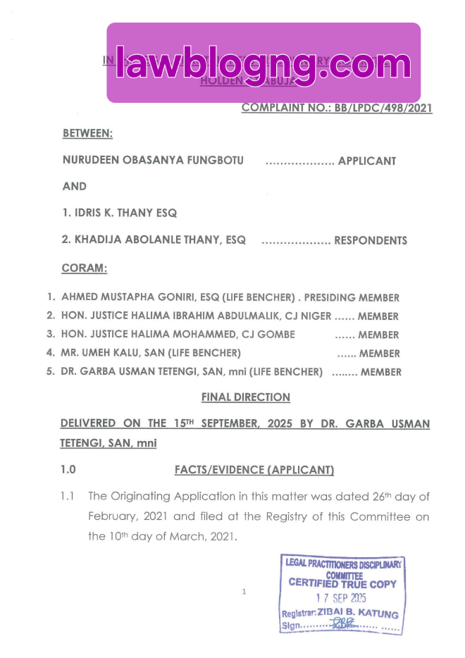 In a direction delivered by the Legal Practitioners Disciplinary Committee (LPDC) on September 15, 2025, Idris Thany was suspended from legal practice for two years after being found guilty of infamous professional misconduct. His sister, Khadijah Abolanle Thany, Esq., was also found complicit in the scandal but escaped suspension after admitting she was misled, receiving only a formal admonition.