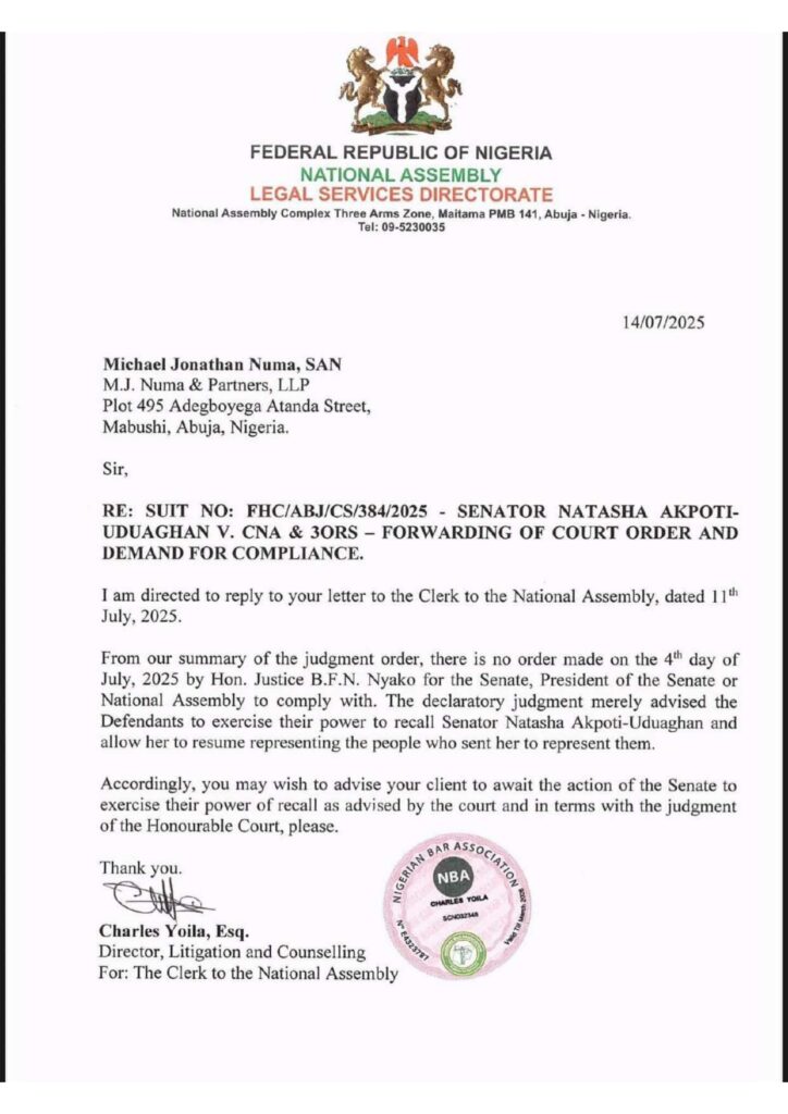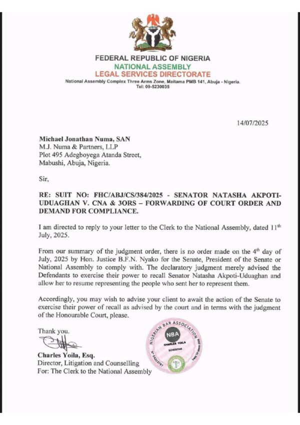 “From our summary of the judgment order, there is no order made on the 4th day of July, 2025 by Hon. Justice B.F.N. Nyako for the Senate, President of the Senate or National Assembly to comply with,” the letter read.