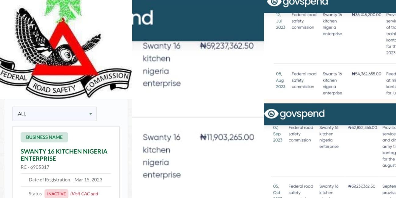 A review of the federal public payments portal, Govspend, by SaharaReporters has revealed that Swanty 16 Kitchen, a newly registered organisation, secured contracts worth N215 million from the Federal Road Safety Commission (FRSC) within just seven months of its incorporation.